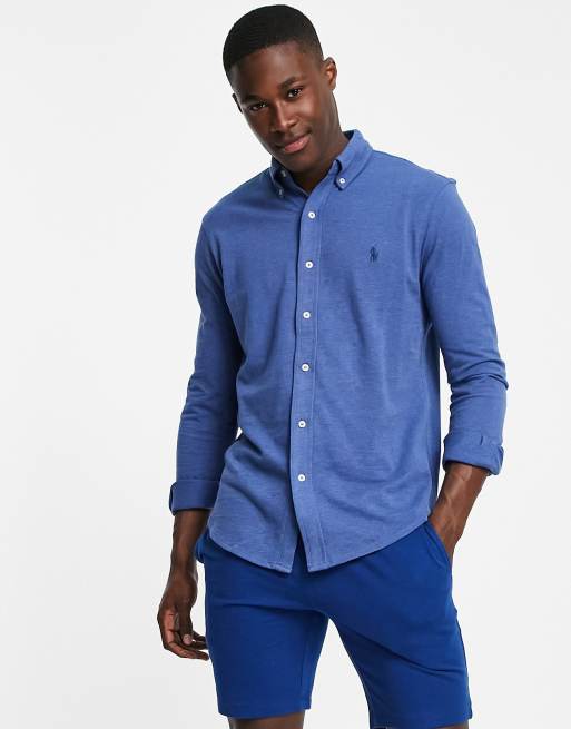 Polo ralph lauren slim fit pique shirt player logo button hot sale down in navy